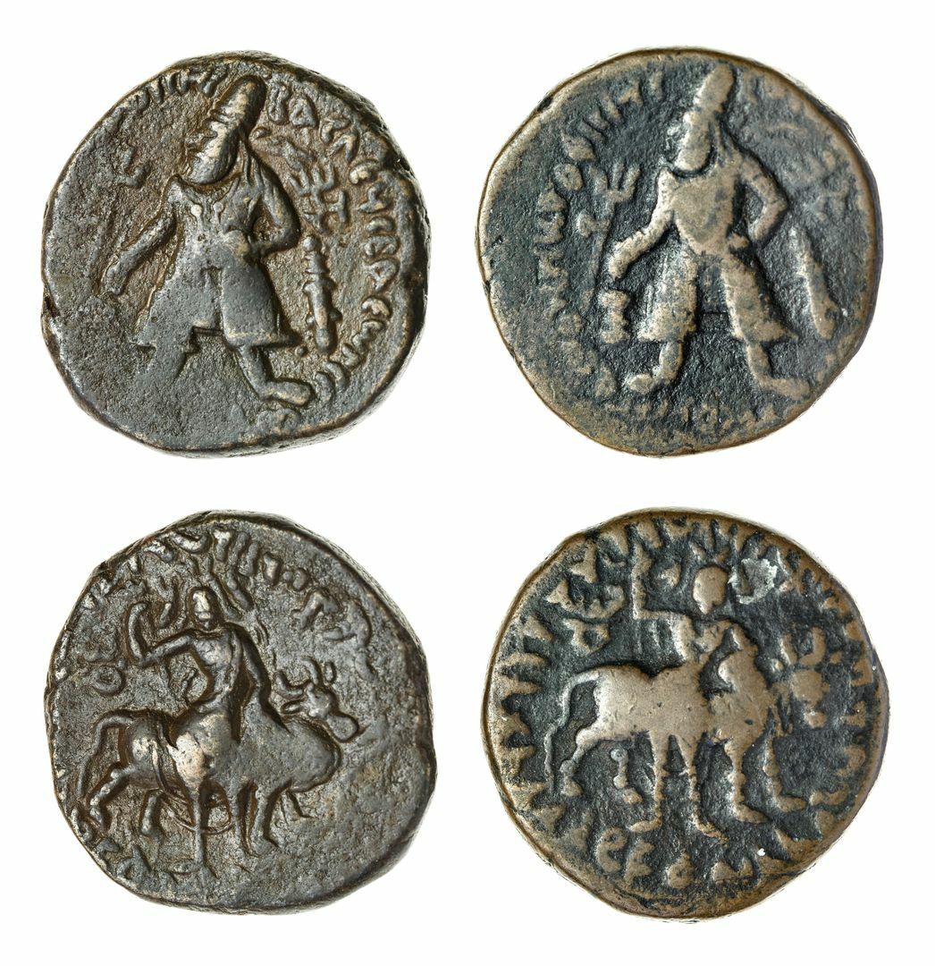 Kushan Empire, Vima Kadphises (c.113-127), AE Tetradrachms (2), 17.28g; 16.43g, Begram, Vima Kadphises standing left, sacrificing over altar left, trident to left, tamgha and club to right, Greek legend, rev. Siva standing facing before bull Nandi, holding trident, Buddhist triratana (Three Jewels) to left, die variants, partial legends on both which combined give a full reading (MK 762; ANS Kushan 274-99 and 303-5; MAC 3008), pleasing dark tones, very fine and good fine (2)