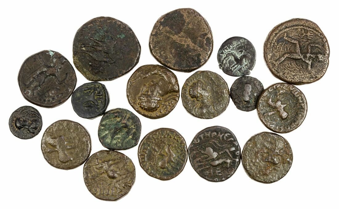 Kushan Empire, Miscellaneous AE Units (12), including Soter Megas (Vima Takto), AE Tetradrachms (6); Drachm, rayed bust right, rev. horseman right, various types; Vima Kadphises, AE Tetradrachm, king sacrificing at an altar, rev. Siva and Nandi, Kanishka, AE Tetradrachm, similar but reverse Oado running left; Huvishka, AE Tetradrachms (2), king seated on cloud, rev. unknown deity, king seated on elephant, rev. Pharro left, Vasudeva, Imitations, AE Quarter-Unit (2) Type 3B, Uncertain mint in Baktria (MAC 2928-60, 2953-2990, 3009, 3111-13, 3255, 3289, 3761), condition varies, average fine; together with Indo-Scythian, AE Units (2); fractional Unit, horseman right, rev. Zeus standing left, fair; Early Kushan, Yuezhi, Sapalbizes (late 1st century BC), Afghanistan, Hemi-Drachm, 1.48g, bust right in the style of Indo-Greek ruler Eucratides, traces of Greek legend, rev. lion standing right with monogram above, legend read as