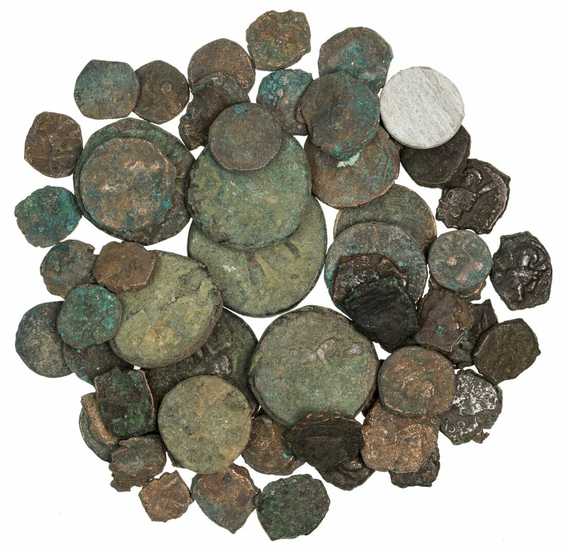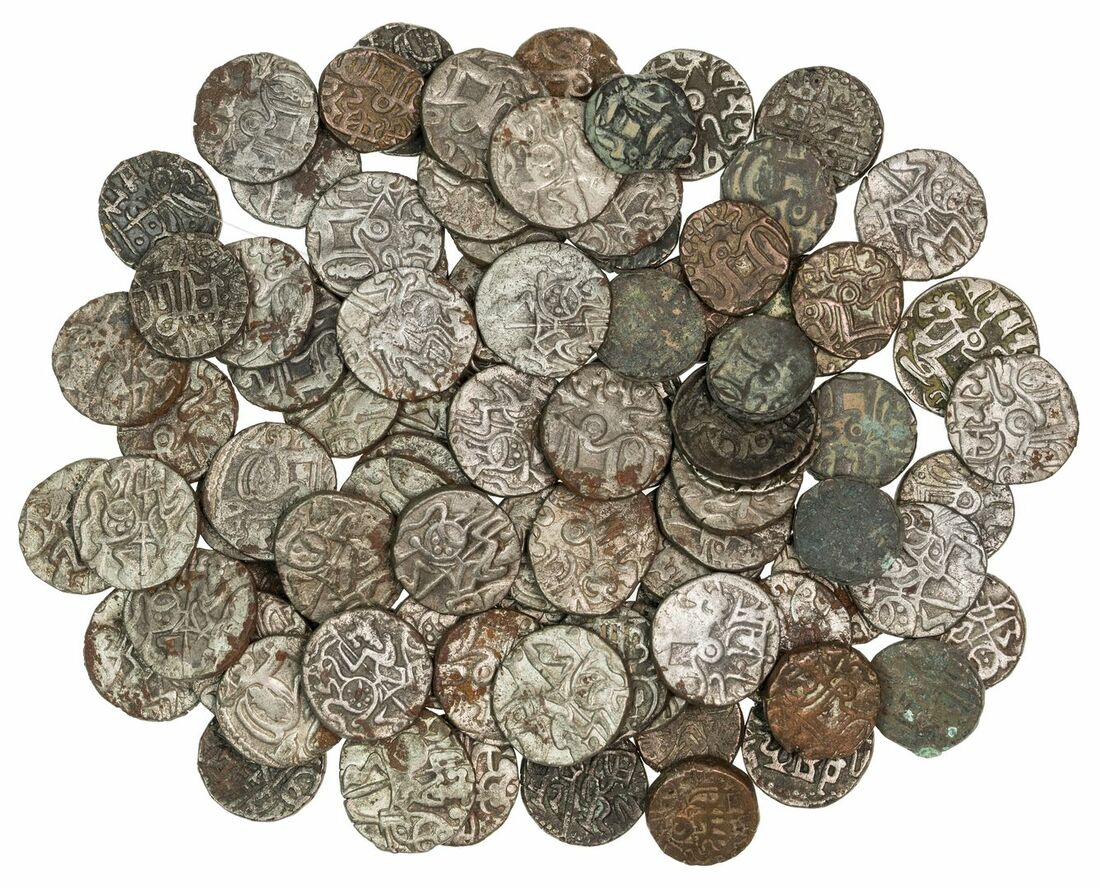 Kushano-Sasanian, Shahpur (Šabuhr) Sasanian Emperor (309-379), AE Units (15), Gandhara (Taxila), bust right wearing distintive crown of Shapur II, rev.  Fire altar (for type cf. MK 1121; ANS Kushan 2398-2405); together with other unidentified Kushano-Sasanian, Units (5), most with irregular shape, unsorted, generally about fine to fine, a couple with readable legend; and, large Kushan, AE Units (9); additionally, other smaller mostly unidentified AE coins (28) of similar region, these mostly poor with some verdigris, but may be identifiable with careful cleaning (57); finally, India, post Shahi rulers of Delhi & Kabul, Delhi Rajas etc. (c.10th -12 century), billon 'bull and horseman' Jitals (87), various types, unsorted, generally good fine to very fine (144)