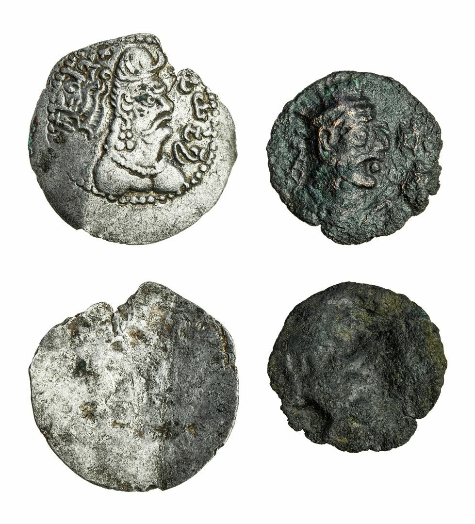Hephthalite, Alchon Huns, Raja Lakhana-Udayaditya (Khingila), (c. 430-490), Drachm, 3.29g, Indian issue, struck ca. 470-480 AD, tall bust right wearing conical crown with crescent, and earring, Brahmi legend, rev. blank (Gobl Hunnen 79.2), flan tear at top, otherwise very fine, scarce; Anonymous AE Drachm, 1.86g of the Hunnic tribes, crowned bust right, rev. blank, fine and scarce (2)