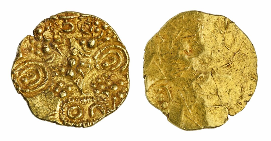 South India, Kalachuris of Kalyana (1156-84), gold Pagoda, 3.41g, obv. on a flan with five lion motifs, four obverse punches: legend read as (Ka)tacheh in Devanagari, two large 'Sris', a sun and moon within a beaded frame, rev. a single punch on a haymarked field (Mitchiner, CHSI, vol.1 277; Chattopadhyaya 116-7), gem uncirculated, rare in this condition