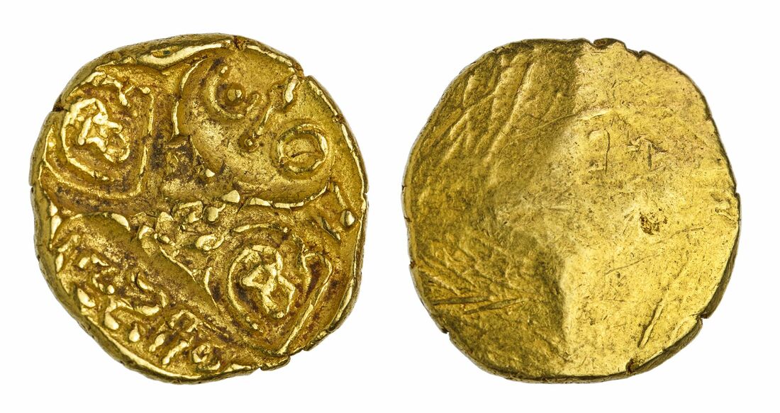 South India, Telegu-Choda (12th-13th century), uniface gold Pagoda, 3.44g, four obverse punches: legend read as Bhujavi in Tamil Grantha script, or Bhujabha in Telegu, two large 'Sris', a spear between sun and moon, struck on a flan over an uncertain central design, possibly a lion (Mitchiner, CHSI, vol.1 313; Chattopadhyaya 424), about uncirculated
