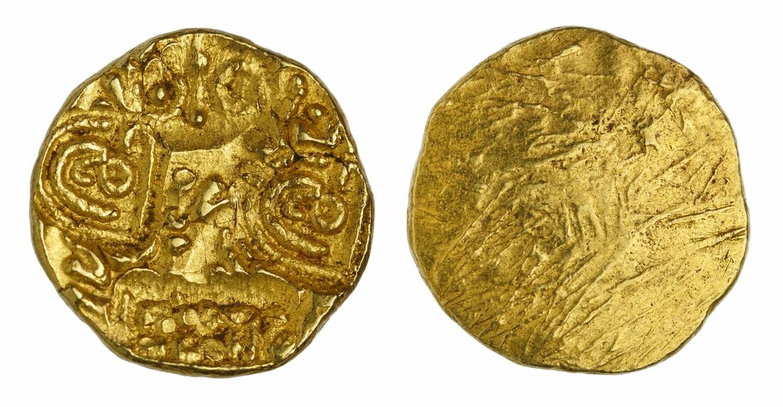 South India, Telegu-Choda (12th-13th century), uniface gold Pagoda, 3.46g, four obverse punches: legend read as Bhujavi in Tamil Grantha script, or Bhujabha in Telegu, two large 'Sris', a spear between sun and moon, struck on a flan over an uncertain central design, possibly a lion (Mitchiner, CHSI, vol.1 313; Chattopadhyaya 424), about uncirculated
