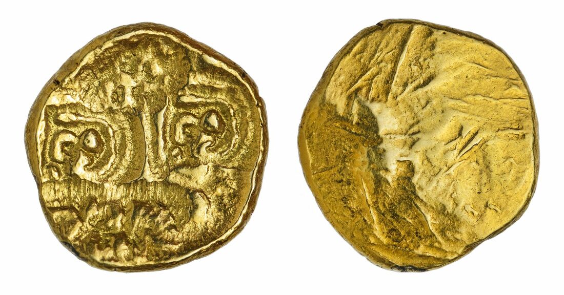 South India, Telegu-Choda (12th-13th century), uniface gold Pagoda, 3.48g, four obverse punches: legend read as Bhujavi in Tamil Grantha script, or Bhujabha in Telegu, two large 'Sris', a spear between sun and moon (Mitchiner, CHSI, vol.1 313; Chattopadhyaya 424), struck with worn dies, but about uncirculated
