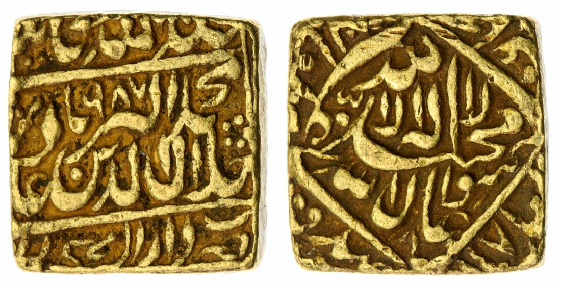 Mughal Empire, Akbar (1556-1605), square gold heavy Mohur or Mohur Token, 12.04g, Dar us-Sultanat Fathpur, AH987 (KM 119.2), probably a token or contemporary copy, edges suspiciously smooth with raised area around text, toned very fine and interesting