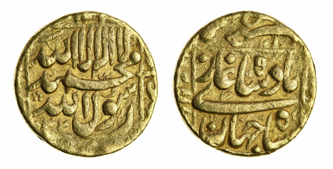 Mughal Empire, Shah Jahan (1628-1658), gold Mohur, 10.91g, mint off flan, attributed to Burhanpur by style, AH(1)044, legends in square frame both sides (KM 260.6), two test punches on edge, very fine