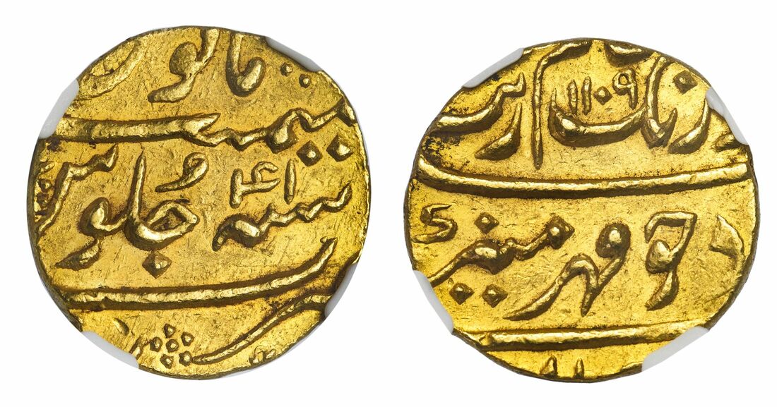India, Mughal Empire, Muhyi al-Din Muhammad Aurangzeb Alamgir (1658-1707), gold Mohur, mint off flan, AH1109/41, shroff marked to the edge, with a residual golden tone, good very fine, in NGC holder, graded AU DETAILS ~ Shroff Marked Edge (Cert. #4863667-025)