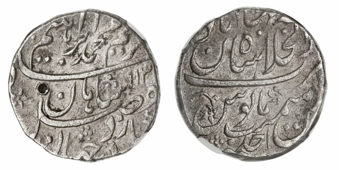 India, Mughal Empire, Muhammad Ibrahim (AH 1132-1133 / 1720 AD), Rupee, AH113-/1 (1720), Shahjahanabad, (KM 426.1), punch marked and minor surface marking, nonetheless very fine and very rare, scarcely encountered even in this condition, in NGC holder, graded XF DETAILS ~ Damaged (Cert. #6318983-002)