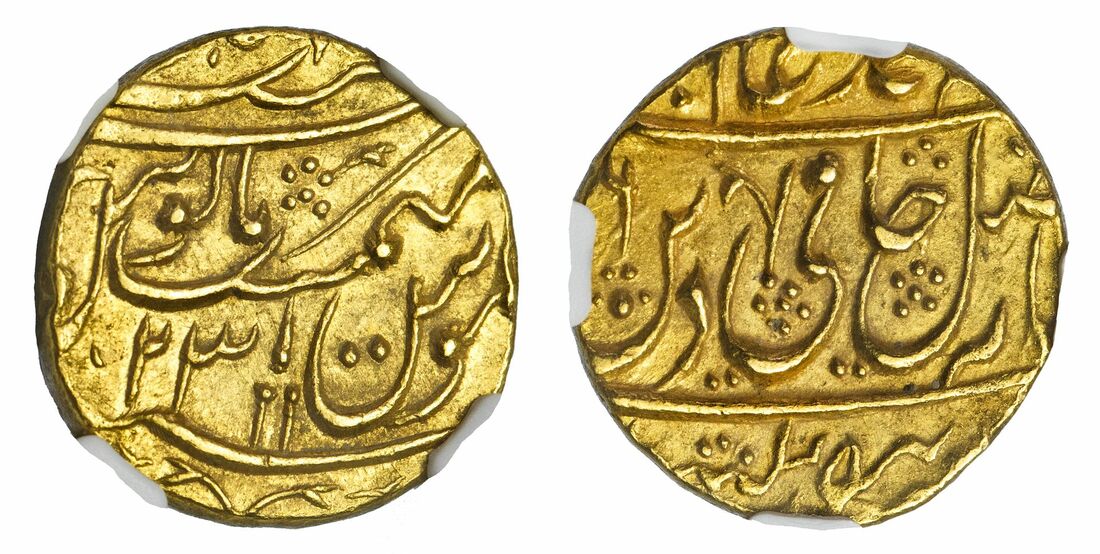(g) Princely States, Awadh, in the name of Shah Alam II, gold Mohur, AH(119)6 / 23, Najibabad, (KM 120), shroff marked to the edge, otherwise a pleasingly bold strike, extremely fine, in NGC holder, graded AU DETAILS ~ Shroff Marked Edge (Cert. #4863615-027)