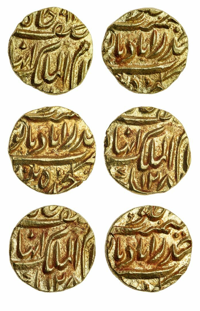 (g) Princely States, Hyderabad, Afzal ad-Daula (1857-1869), gold Quarter-Mohurs (3), 2.75, 2.76, 2.80g, Farkhanda Bunyad Haidarabad, dates unclear or off flan, AH128- where visible, asaf jah nizam al-mulk with alif for Afzal before mulk (KM Y# 9), good extremely fine to uncirculated (3)