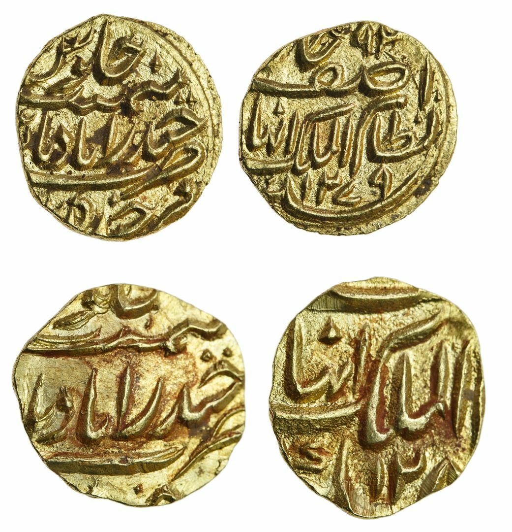 (g) Princely States, Hyderabad, Afzal ad-Daula (1857-1869), gold Eighth-Mohurs (2), 1.39, 1.42g, Farkhanda Bunyad Haidarabad, the first AH1279, the second with AH128-, asaf jah nizam al-mulk with alif for Afzal before mulk (KM Y# 8), both uncirculated or nearly so (2)