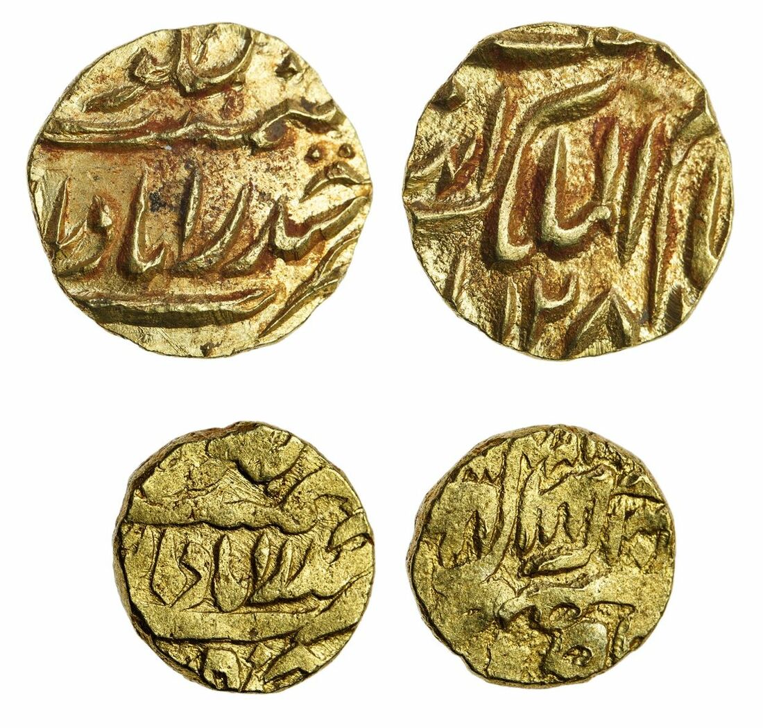 (g) Princely States, Hyderabad, Afzal ad-Daula (1857-1869), gold Eighth-Mohurs (2), both 1.39g, Farkhanda Bunyad Haidarabad, the first apparently AH1281 but only top of last digit visible, the second 1283, clear date, asaf jah nizam al-mulk with alif for Afzal before mulk (KM Y# 8), the first with reddish tone, about uncirculated, the second good fine (2)