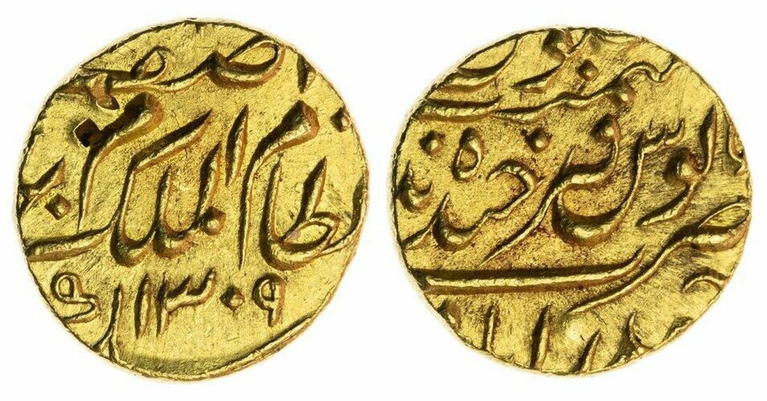(g) Princely States, Hyderabad, Mir Mahbub 'Ali Khan II (1869-1911), gold Mohur, 11.17g, Farkhanda Bunyad Haidarabad, AH1309 / ry. off flan, asaf jah nizam al-mulk with m for Mahbub above mulk (KM Y# 22), small obverse test punch, good extremely fine