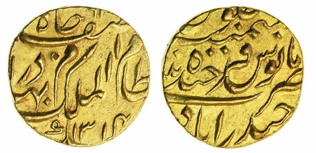 (g) Princely States, Hyderabad, Mir Mahbub 'Ali Khan II (1869-1911), gold Mohur, 11.16g, Farkhanda Bunyad Haidarabad, AH1314 / ry. off flan, asaf jah nizam al-mulk with m for Mahbub above mulk (KM Y# 22), small obverse test punch, extremely fine