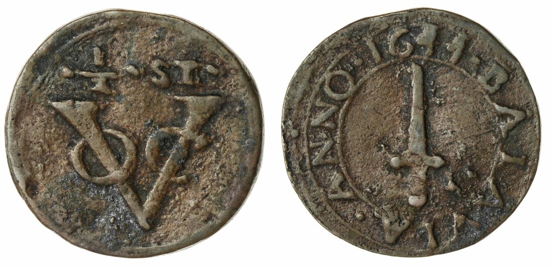 This very short-lived emergency coinage was authorised by a Placard of 19 August 1644. It gave 'the Chinaman called CONJOK' the right to produce a certain number of Half and Quarter Stivers. Scholten tells us that this was to redress the shortage of small change in Banda, Malacca and Ceylon as well as Batavia itself. A prohibition was issued by the Dutch East India Company later that year, so it appears these coins were only struck for a few months. It is not known how many were struck, but the Quarter-Stivers are certainly far rarer than the Half-Stivers today.