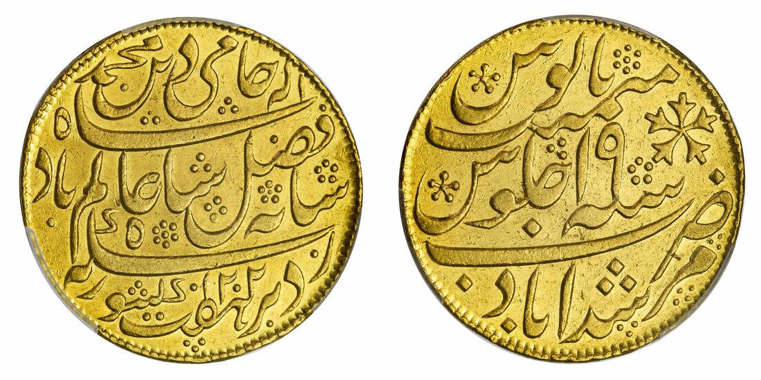 (g) East India Company, Bengal Presidency, Shah Alam II (1759-1806), gold Mohur, AH1202/19, Murshidabad (Calcutta), obliquely milled edge, 1h (Pr. 71; Stevens 5.2), wiped and with a a scattering of very light contact marks to otherwise handsomely lustrous surfaces, extremely fine, in PCGS holder, graded AU DETAILS ~ Cleaned (Cert. #407996.92/39653019)
