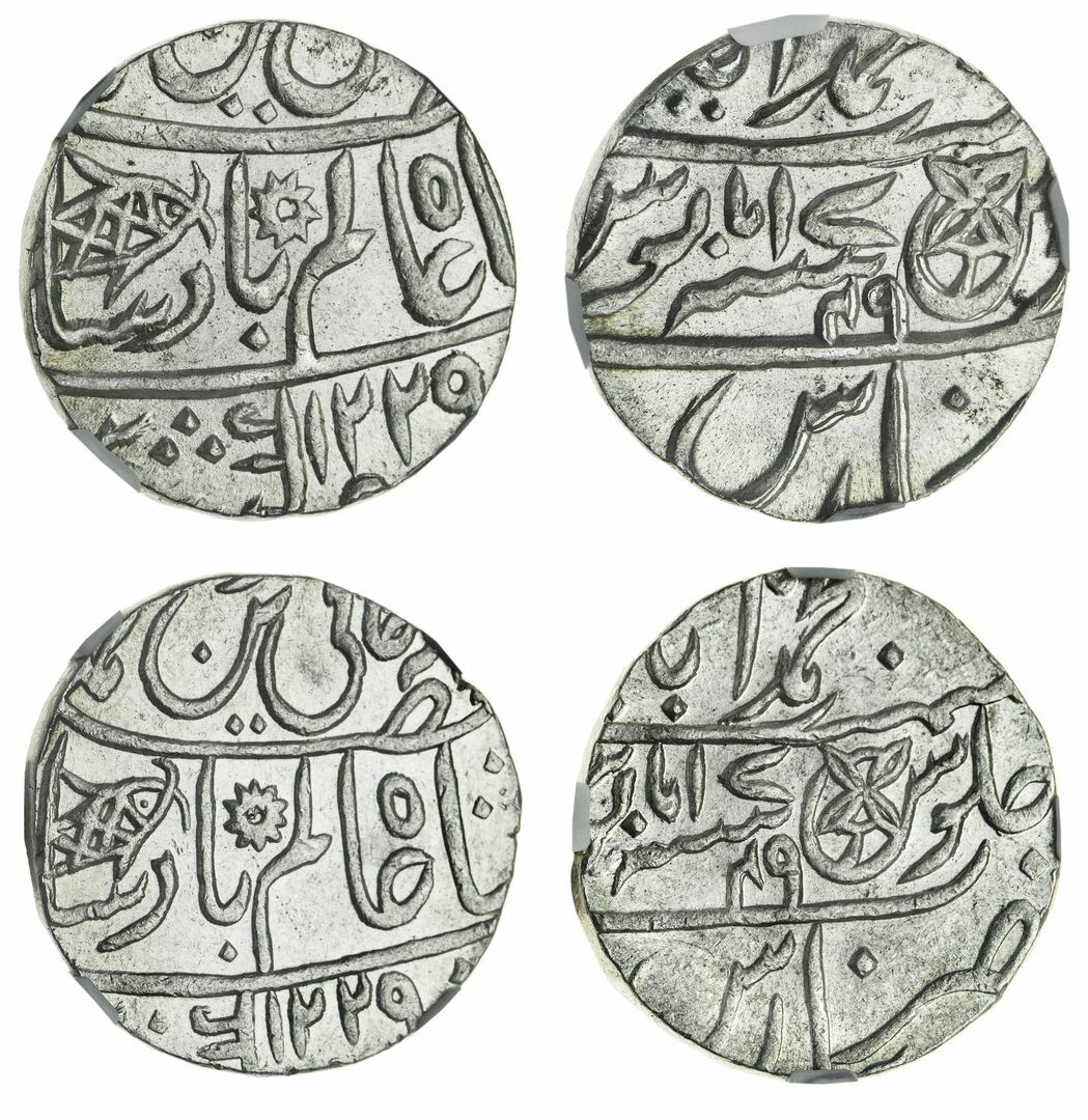 NGC MS65 | East India Company, Bengal Presidency, Rupee, in the name of Shal Alam II Badshah, Muhammadabad Banaras (Lucknow), AH 1229/49 (1749), (KM 41), with a pleasing mint bloom, much as struck, in NGC holder, graded MS65 (Cert. #6033158-007); another, NGC MS63 | AH1229/49 (1749), (KM 41), some minor friction marking, otherwise with a pleasing mint bloom, much as struck, in NGC holder, graded MS63 (Cert. #6033156-079) (2)
