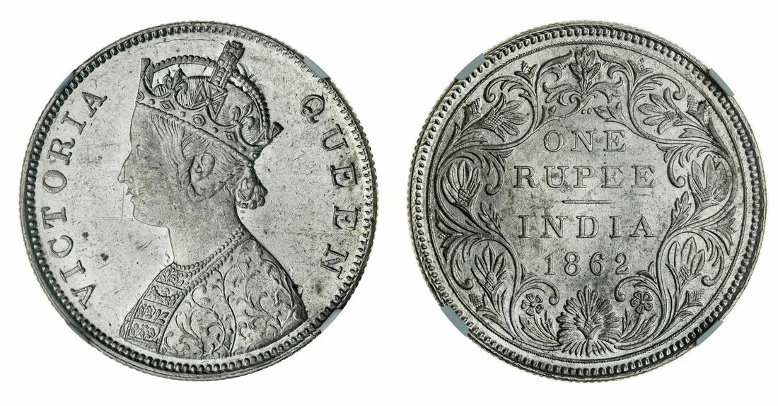 NGC MS62 | British India, Victoria (1837-1901), Rupee, 1862 B, Type B/2A, 2/0, issued 1864/65 (S & W 4.63a), friction marked, otherwise uncirculated, scarce type, in NGC holder, graded MS62 (Cert. #6766255-006)
