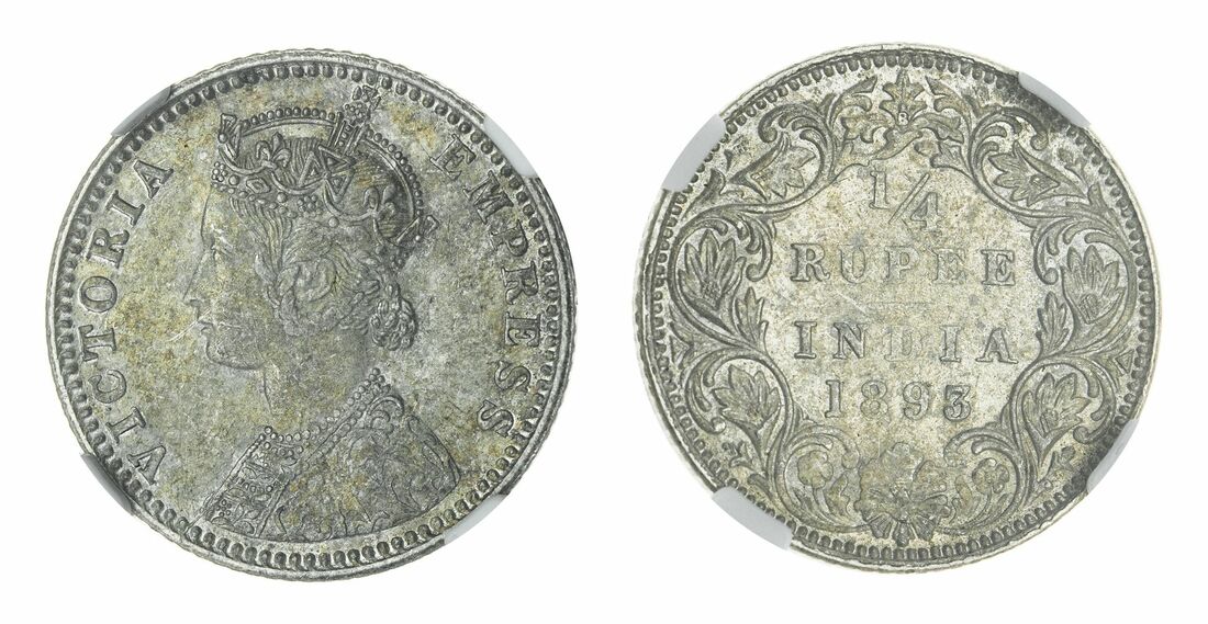 NGC MS61 | British India, Victoria (1837-1901), Quarter-Rupee, 1893 B incuse (S & W 6.318), lightly toned and lustrous, uncirculated, in NGC holder, graded MS61 (Cert. #6766255-075)