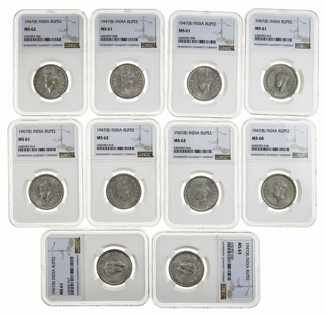 NGC MS60-MS63 (10) | British India, George VI (1936-1952), Rupees, 1947 B (10), crowned bust left, rev. Indian tiger, engrained edges, (KM 559), all uncirculated, in NGC holders, graded MS60 (1); MS61 (5); MS62 (3); MS63 (1) (Certs. #6382907-006/008/009/012/013/014/015/017/018/020) (10)