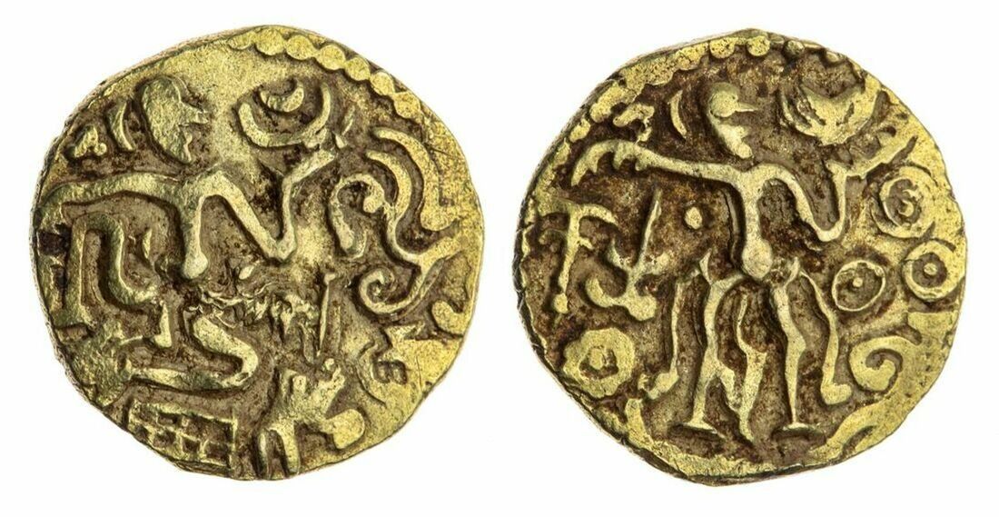 (x) Sri Lanka (Ceylon), Anonymous (c.960-1214), gold Kahavanu, 4.39g, type II (3), adahanda (half-moon) both sides, standing figure of Ceylon style, palm tree and lamp stand under arm in left field, holding adahanda right, three annulets below right, beneath feet a line connecting an open flower left and a conch right, rev. figure seated right on an asana (low throne), holding an adahanda (half-moon), Devanagari legend in right field Sri Lamka Vibhu (fortunate lord of Sri Lanka) (Codrington 49; Mitchiner, Southern India, part 2, -), a few defects and flat sections on edge, otherwise extremely fine, scarce