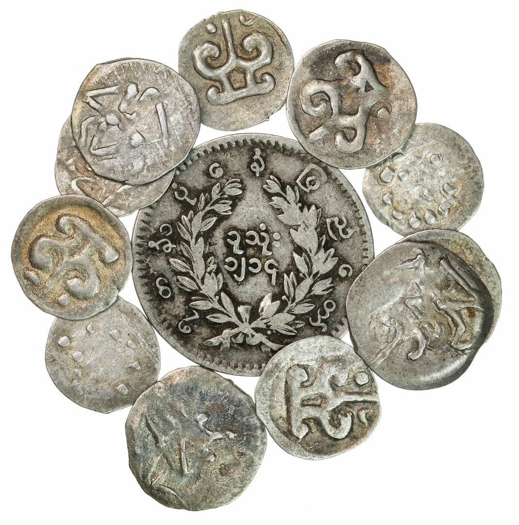 Burma, Mon Kingdom of Sudhammapura, Mi-chen (Thaton) (late 8th century to 835), Bracteates of 1-Ratti (11), Damaru, rev. temple in shape of srivatsa, some uniface or with obverse designe incuse (Mitch. SEA.541-3), most extremely fine or better; Burma (Myanmar), milled Mu (1/8-Kyat), CS1214 (1852), peacock / denomination within wreath, (KM 7.1; R & S 11.4), scarce, good fine (12)