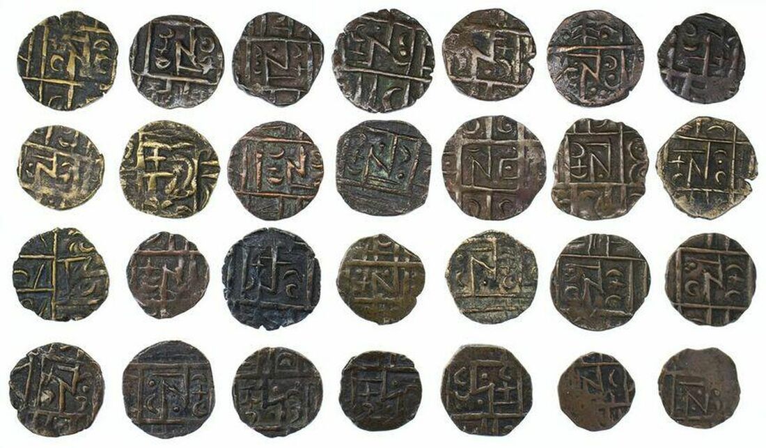 (x) Bhutan, Period II/III (c. 1840-1900), Copper and Brass Half-Rupees (28), including, range of types, 'ndra', cross over 'ra', rev. 'va cha ra' (Bronny 21.01; 21.02; 21.04; 21.05; 21.06; 21.09 [these coins]; cf. KM 8); 'ndra' retrograde, cross to left, rev. 'va cha ra' (Bronny 23.01; 23.02g; 23.03; 23.04; 23.05; 23.06g; 23.09; 23.10; 23.11; [these coins]; cf. KM 8); large hook with star above 'ndra', rev. 'va cha ra' (Bronny 23.08 [this coin]; cf. KM 8); 'nd' retrograde, 'ra' correct, rev 'va cha ra' (Bronny 24.01; 24.02g; 24.04g; 24.05h [these coins]; cf. KM 8); with tree, rev. 'va cha ra' (Bronny 5.02 [this coin]; cf. KM 8); with two crescents, rev. 'va cha ra' (Bronny 26.01; 26.02; 26.04; 26.05; 26.07; 26.08 [these coins]; cf. KM 8); 'dra' retrograde, 'va cha' retrograde with dot, rev. 'va cha ra' (Bronny 26.11 [this coin]; cf. KM 8), very fine to extremely fine (28)