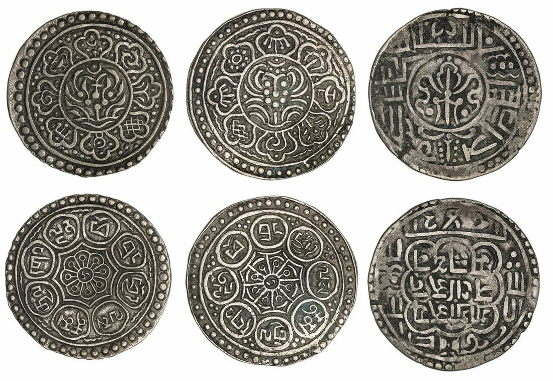 Nepal, Kingdom of Bhatgaon, Jaya Ranajit Malla (1722-1769), Mohar, 5.33g, NS 842, trident, with rounded tie, rev, legend in scalloped square, issued for Tibet (Rhodes, Nepal 611; RGV 564; KM 108), surfaces blackened, as usual for this type, fine; Tibetan Government, Anonymous (Type B. 1880-94), Gaden Tangka, 4.78g, Dod-pal mint, undated, lotus flower, with two wavy lines beneath, three beads between outer 'petals', rev. spoked wheel with wavy lines between outer petals, (Type E. c.1899-1907), Gaden Tangka, 5.07g, Dod-pal mint, undated, lotus flower, with wavy line between outer 'petals', rev. spoked wheel with three beads between outer petals (Rhodes Biv, Ei; KM Y. B13.4, E13.1), the first toned, good very fine, the second very fine (3)