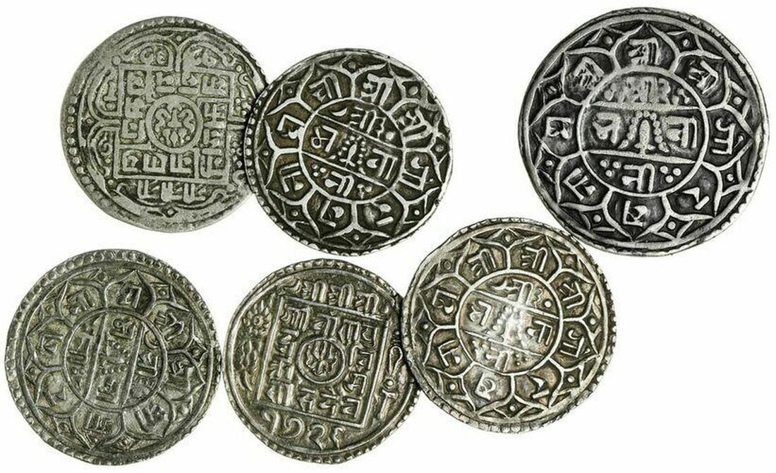 (x) Nepal, Girvan Yuddha Vikram Shah, for Kathmandu Valley (1799-1816), 3-Mohar, Type 3, SE 1725, trident in circle, rev. sword with garland, eight petals around, 16.13g (Rhodes, Nepal 788; RGV 767), some rub to the highest points, otherwise a clear strike, very fine example of this scarcely encountered denomination; 1-½-Mohar, Type 1, SE 1726, trident in circle, rev. sword with garland, eight petals around, 8.26g (Rhodes, Nepal 790; RGV 770), pleasingly lustrous, extremely fine; Mohar, Type 3, SE 1729, trident in circle, rev. sword with garland, eight petals around, 5.49g (RGV 781), toned, good very fine; Mohar, Type 2, SE 1730, as before, 5.61g (Rhodes, Nepal 801; RGV 782), very fine;  Mohar, Type 2.1, SE 1737, as before, 5.25g (Rhodes, Nepal 811; RGV 790), rubbed, bolder fine; Mohar, Type 2.1, SE 1738, 5.51g (Rhodes, Nepal 809; RGV 788), bright, yet very fine (6)