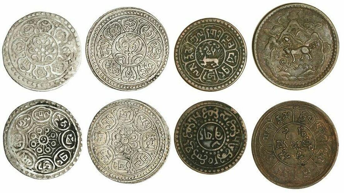 (x) Tibetan Government, Anonymous, Gaden Tangka, Group B, (c. 1880-1892), 4.14g (KM YB13), slightly flat and deposits in fields, about very fine; Gaden Tangka, Group F, (c. 1912-1922), 4.56g (KM YF13.5), handsome strike, good very fine; 5 Sho, BE 16-25 (1951), 8.38g, (KM Y28a), hints of mint red, good very fine; Sho, BE15-56, (1922), (KM Y21.1a), about very fine (4)