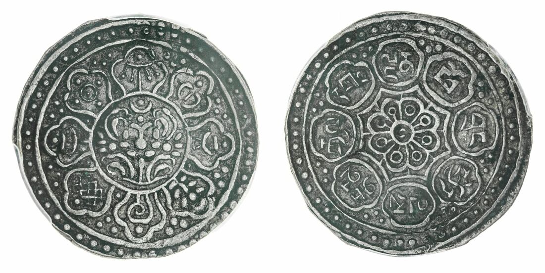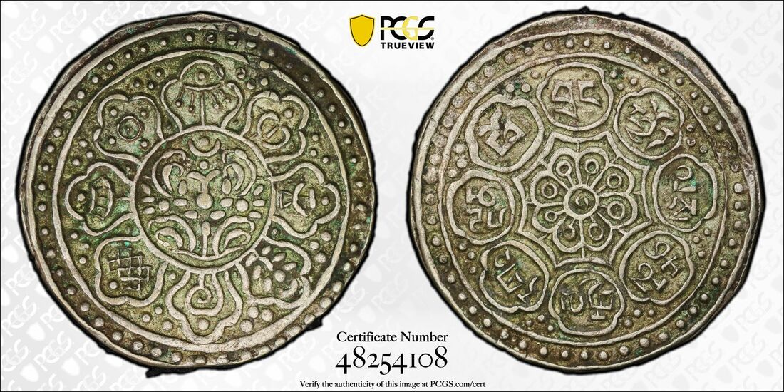 PCGS XF45 | Tibetan Government, Anonymous, Gaden Tangka, Class D, c. 1896-1899, three dots between petals, rev. with spokes, three dots between petals, (LM 630; Rhodes Dii; Y D13.2), touch of softness in parts, otherwise a pleasingly bold strike, toned, extremely fine, in PCGS holder, graded XF45 (Cert. #48254108)
