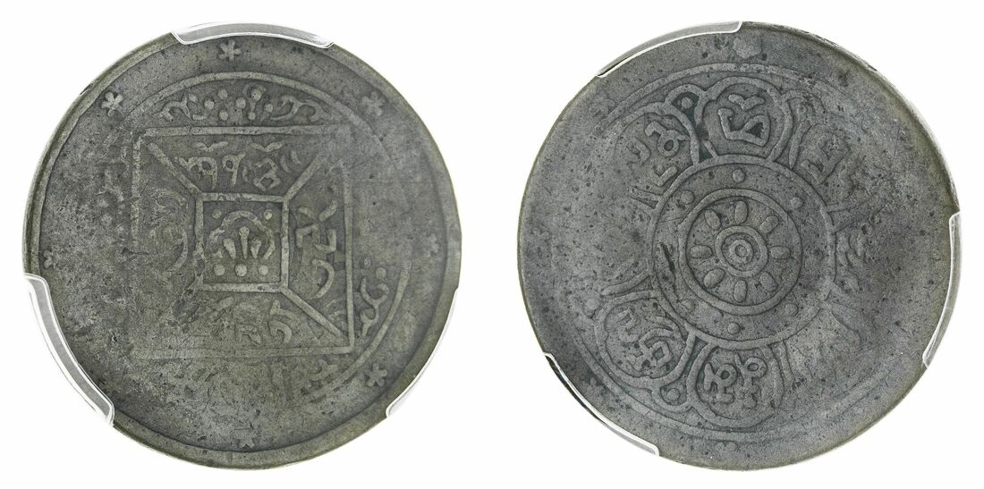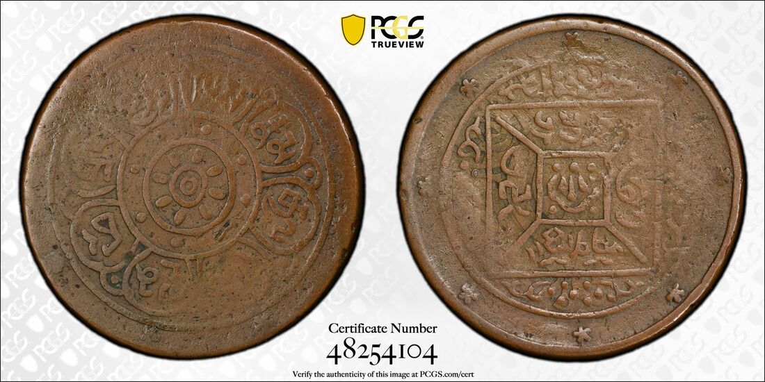 PCGS F15 | Tibet, Xuan Tong, AE 1/8th-Sho, 1st Year (1909), central square, rev. emblems within eight lotus petals, plain edge, (cf. Rhodes 2013, lot 328-329; KM Y A7), good fine for type and scarce, in PCGS holder, graded F15 (Cert. #48254104), incorrectly identified as Quarter-Sho (Y-B7) by PCGS