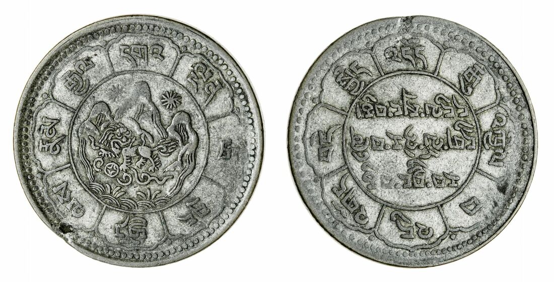Originally these 10-Srang coins were struck by the 'du- 'god las-khungs' to pay Tibetan army members. This office was located within the compound of the Tibeta army at Trabshi to the west of the Government factory and mint. The symbols 'du- 'god have the meaning "affairs or "dealings" and the expression 'du- 'god las-khungs' refers to an office which was dealing with the salaries of soldiers. This type of 10-Srang coin was struck only during two years and must have circulated along with the regular government issues.