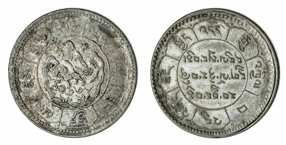 Originally these 10-Srang coins were struck by the 'du- 'god las-khungs' to pay Tibetan army members. This office was located within the compound of the Tibeta army at Trabshi to the west of the Government factory and mint. The symbols 'du- 'god have the meaning "affairs or "dealings" and the expression 'du- 'god las-khungs' refers to an office which was dealing with the salaries of soldiers. This type of 10-Srang coin was struck only during two years and must have circulated along with the regular government issues.