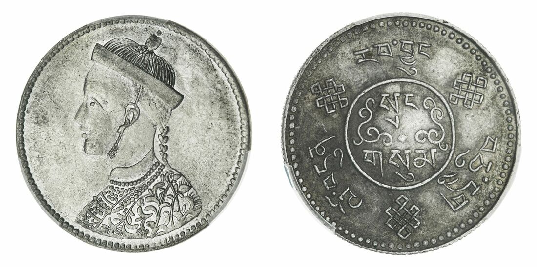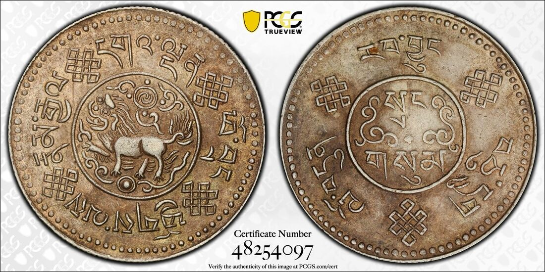 PCGS AU55 | Tibetan Government, Anonymous, First Issue, 3-Srang, 16-7 (1933), Trabshi mint, snow lion facing left, rev. denomination in two lines, flanked by ornaments and a small cross, milled edge, 12h (cf. Rhodes 2013, lot 369; LM 659; Y 25), touch of softness to the higher points, nonetheless toned, near extremely fine, in PCGS holder, graded AU55 (Cert. #48254097)