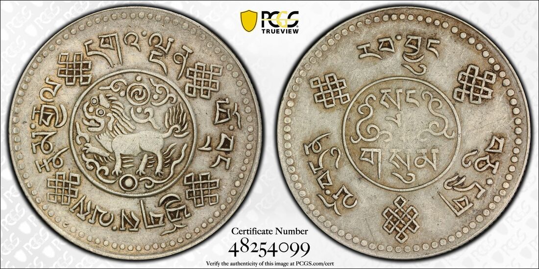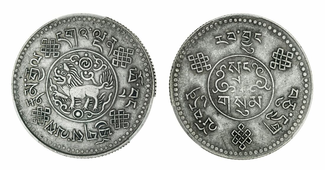 PCGS XF40 | Tibetan Government, Anonymous, First Issue, 3-Srang, 16-7 (1933), Trabshi mint, snow lion facing left, rev. denomination in two lines, flanked by ornaments and a small cross, milled edge, 12h (cf. Rhodes 2013, lot 369; LM 659; Y 25), touch of softness to the higher central devices, yet with a light tone, good very fine, in PCGS holder, graded XF40 (Cert. #48254099)
