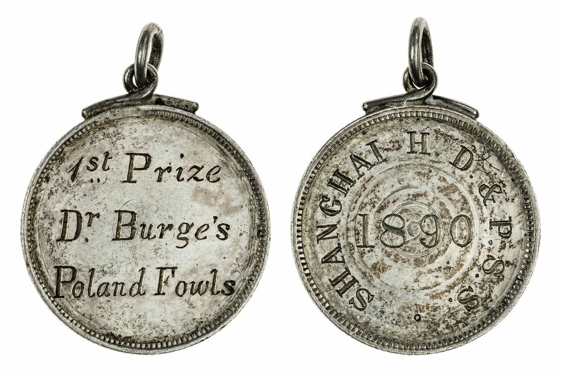 China, Shanghai, Dr Burge's Poland Fowls, First Prize, AR Medallet, 1890, engraven over engine-turned Victorian Shilling, SHANGHAI H. D. & P. S. S., 1890 at centre, rev. 1st Prize | Dr Burge's | Poland Fowls, 4.93g, 12h, light surface marks and toning, extremely fine and presumably very rare
