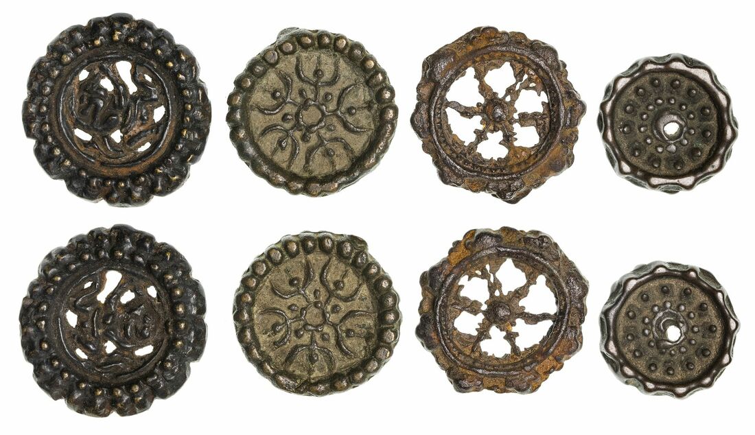 Thailand (18th-19th century), Gambling Tokens (Bpee) (4), 27mm, open-work design featuring figure of Hanuman running left within decorated outer rim, 24mm, 5-spoked wheel design within decorated outer rim, 25mm open-work 6-spoked wheel within an eight-lobed outer rim, 20.5mm, beads within a crenellated border, pierced in centre, generally very fine or better, rarely offered and interesting (4)