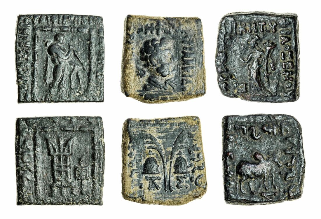 Indo-Greek Kingdom, Antialcidas (c.145-135 BC), square AE Unit, 8.57g, bust of Zeus right, rev. two palms between caps of the Dioscuri, a monogram below each (Bopearachchi 17; SNG ANS 1122; M.280), both sides heavily cleaned and still a little dirty, very fine; Philoxenos (c.125-110 BC), square AE Unit, 8.24g, female deity standing left holding a cornucopia right and uncertain object (possibly a palm) left, monogram bottom left, rev. zebu standing right (Bopearachchi 10E; SNG ANS 1204; M.344), very fine; Apollodotus II (c.110-80 BC), square AE Unit, 8.66g, Apollo standing right holding an arrow, with bow resting on ground right, rev. club of Herakles, Kharoshthi legend, monograms either side (Bopearachchi 16; SNG ANS 1594; M.426), very fine(3)