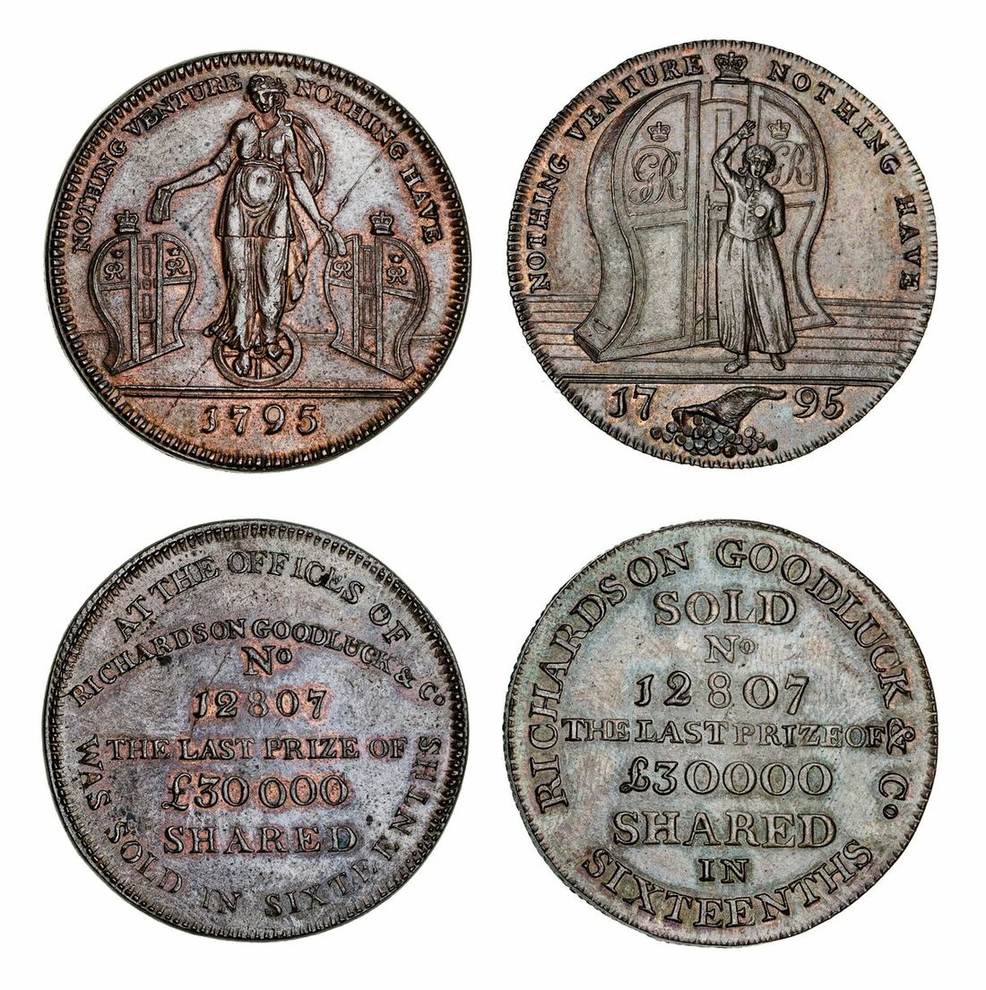 MIDDLESEX, London, Richardson Goodluck & Co, Halfpenny, 1793, figure of Fortune standing between lottery wheels, rev. eight line inscription, plain edge, 6h, 10.71g (D&H 467), die flaw through the obverse and with a touch of softness to the higher points, wiped and with residue, yet with hints of red, bolder very fine; another, 1795, bluecoat boy preparing to draw from a lottery wheel, rev. nine line inscription, plain edge, 6h, 10.62g (D&H 471), lustrous and some red to the fields, good extremely fine (2)