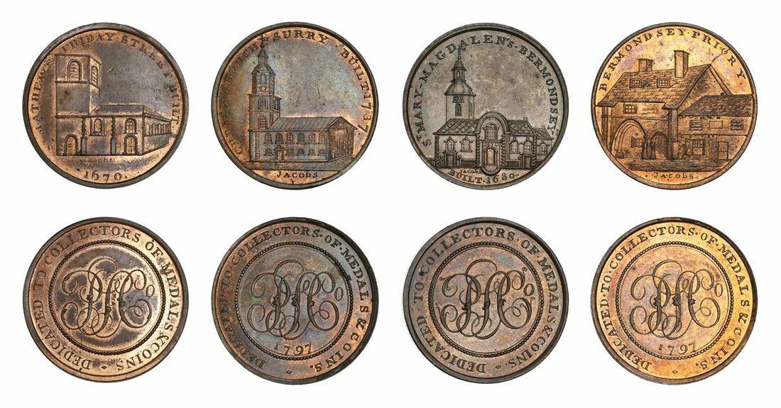 MIDDLESEX, Skidmore's London Churches and Gates Series, St Mathew's Friday Street, Halfpenny, undated, plain edge, 11h, 11.37g (D&H 585), couple of bagmarks, otherwise with mostly mint red surfaces, as struck; Bermondsey, St Mary Magdalen's, Halfpenny, undated, 11h, 11.76g (D&H 664a), lightly marked, lustrous to brown surfaces, good extremely fine; Bermondsey Priory, Halfpenny, 1797, plain edge, 12h, 11.44g (D&H 667), with full mint red surfaces, as struck; Southwark, Christ Church, Halfpenny, 1797, plain edge, 12h, 11.65g (D&H 670), scattering of light contact marks, otherwise brilliant, red beneath toned surfaces, good extremely fine (4)