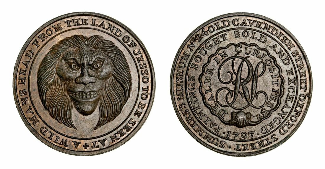 MIDDLESEX, London, Richard Summers' Museum, Halfpenny, 1797, A WILD MANS HEAD FROM THE LAND OF JESSO TO BE SEEN AT, head of wild man, rev. SUMMERS'S MUSEUM No. 24 OLD CAVENDISH STREET OXFORD STREET, RS larger cypher within, plain edge, 6h, 16.18g (D&H 906), faintest of friction marking to the reverse, nonetheless with a pleasing flashy lustre and with hints of red to otherwise light brown surfaces, good extremely fine and ever popular