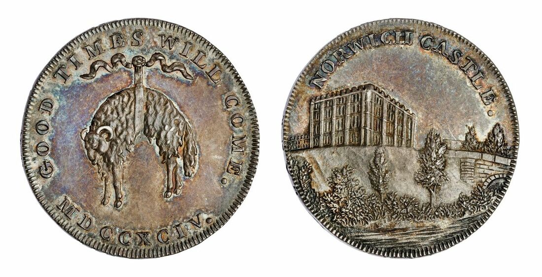 NORFOLK, Norwich, Richard Bacon, Silver Halfpenny, 1794 [MDCCXCIV], NORWICH CASTLE, view of Norwich Castle, rev. GOOD TIMES WILL COME., hanging fleece, MDCCXCIV. below, RICHARD BACON COCKEY LANE on edge, 6h, 11.71g (D&H 13), light scattering of hairline contact marking to the fields, otherwise with a rich cabinet tone and glossy brilliance, much as struck