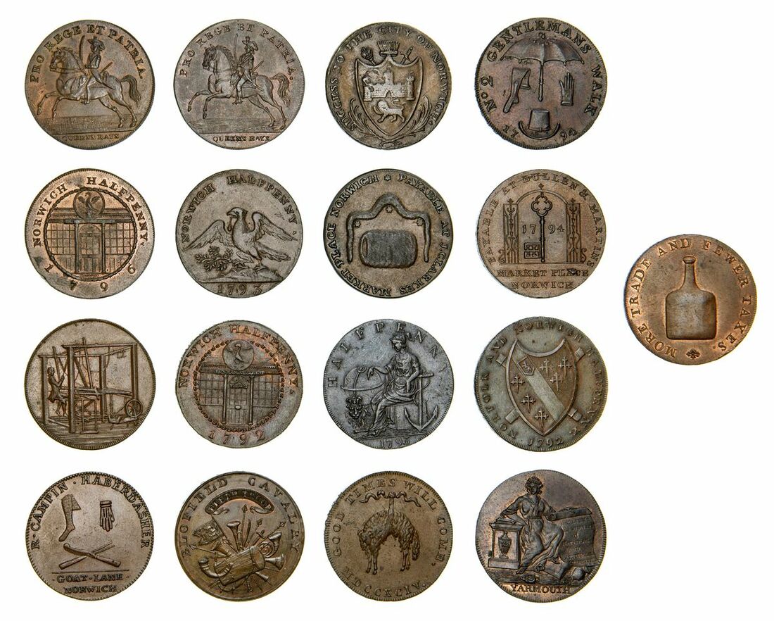 NORFOLK, Blofield, Loyal Norfolk Yeomanry, Halfpenny, 1796 [MDCCXCVI], FEAR GOD AND HONOUR THE KING on edge, 12h, 12.74g (D&H 6), handsome glossy brilliance and with areas of red to light brown surfaces, much as struck; Norwich, Richard Bacon, Halfpenny, 1794 [MDCCXCIV], RICHARD BACON COCKEY LANE on edge, 6h, 9.84g (D&H 12), pleasing light brown surfaces, extremely fine; Bolingbrokes, Halfpenny, 1792, PAYABLE AT N. BOLINGBROKES HABERDASHER &C. NORWICH on edge, 6h, 11.57g (D&H 14), wiped, otherwise about extremely fine; Bullen & Martins, Halfpenny, 1794, plain edge, 12h, 9.89g (D&H 19), hairline die flaws, yet lustrous, handsome extremely fine; Goat Lane, Halfpenny, 1793, CURRENT EVERY WHERE on edge, 12h, 9.94g (D&H 20), lightly contact marked and dark, yet extremely fine; another, as before, 12h, 9.39g (D&H 20), lightly wiped and contact marked to the obverse, otherwise about extremely fine; J. Clarkes, Halfpenny, 1794, PAYABLE AT CRONBANE OR IN DUBLIN on edge, 12h, 10.38g (D&H 22a), faintly contact marked, otherwise good very fine; another, as before, plain edge, 6h, 9.74g (D&H 22)< bolder fine; 'Prosperity To Old England' Halfpenny, undated, plain edge, 12h, 8.97g (D&H 23b), handsome flashes of red, good extremely fine; Robert Dunham & John Yallop, Halfpenny, 1792, PAYABLE AT THE SHOP OF DUNHAM & YALLOP GOLD-SMITHS. on edge, 6h, 10.46g (D&H 27), hairline die flaws to reverse, soft to higher points, yet areas of mint red, extremely fine; another, as before, 6h, 11.36g (D&H 27), very fine; another, 1793, PAYABLE AT THE SHOP OF DUNHAM& YALLOP GOLD-SMITHS on edge, 6h, 11.41g (D&H 31), very fine; another, 1796, obliquely milled edge, 6h, 9.65g (D&H 33), handsome red tone, good extremely fine; John Harvey, Halfpenny, 1792, IOHN HARVEY OF NORWICH on edge, 12h, 11.61g (D&H 38), lustrous, mint red to the edges of devices, good extremely fine; 'Queens Bays' Barracks, Halfpenny, 1793, plain edge, 6h, 10.20g (D&H 46a), toned to the reverse, otherwise with pleasing red around the devices, extremely fine; another, as before, sword closer to ET, plain edge, 12h, 10.35g (D&H 47), lustrous and with pleasing red beneath light brown surfaces, good extremely fine; Yarmouth, Joshua Danial & John Boulter, Halfpenny, 1796, PUBLISHED BY JOS. DANL. & JNO. BOULTER on edge, 6h, 11.10g (D&H 53), handsome glass-like lustre in the fields, red to the edges of devices, much as struck (17)