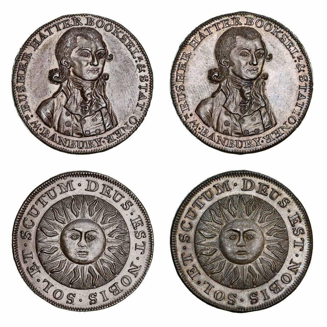 OXFORDSHIRE, Banbury, William Rusher Hatter, Halfpenny, undated, draped bust almost facing, rev. radiant sun, PAYABLE AT BABURY READING OR OXFORD on edge, 6h, 9.93g (D&H 1), residual lustre to light brown surfaces, extremely fine; another, as before, 6h, 9.82g (D&H 1), light marking to otherwise residually lustrous and somewhat lacquered and uniformly brown surfaces, extremely fine (2)