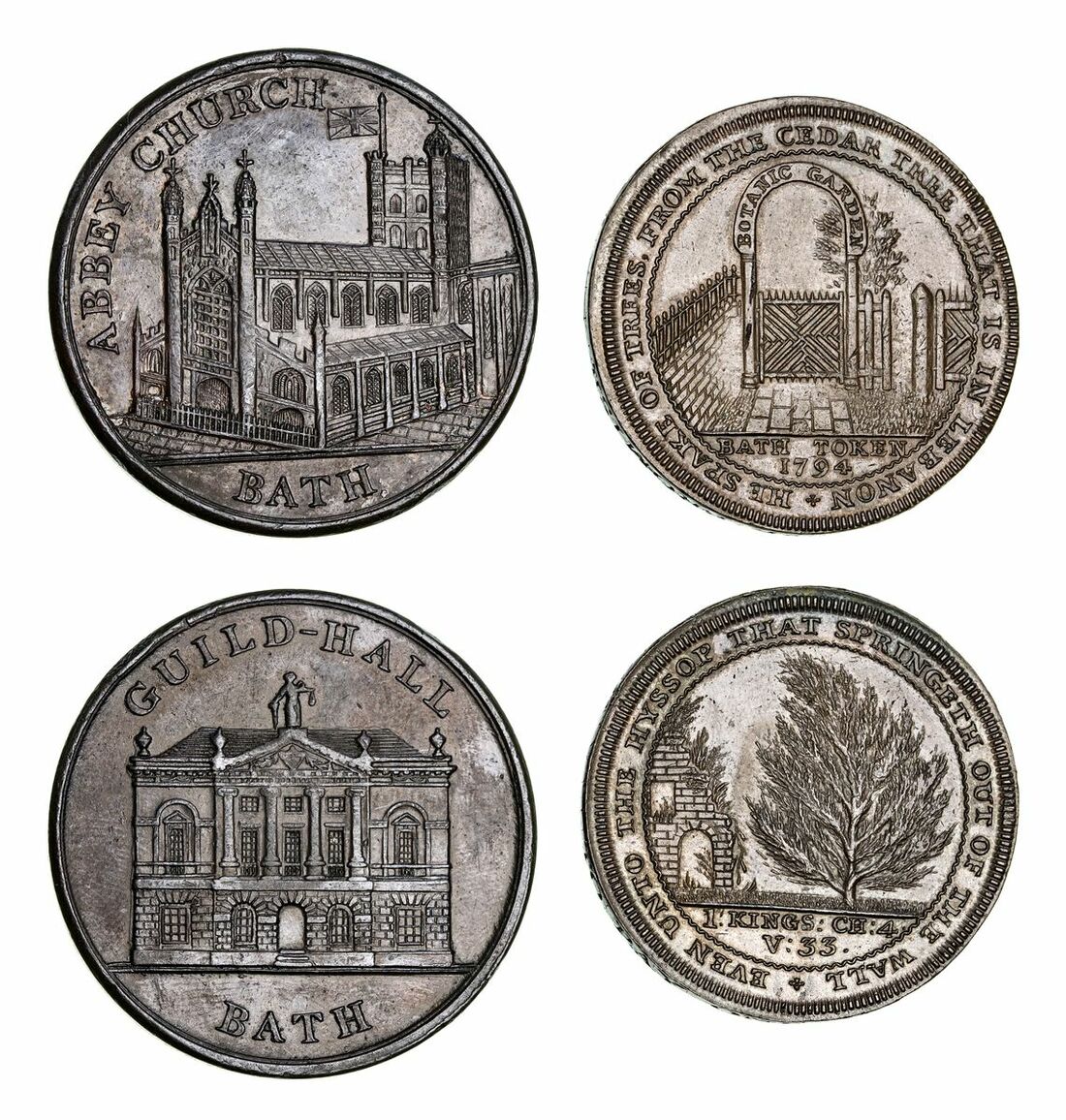 SOMERSET, Bath, John Jelly, Lutwyche's Penny 1794, HE SPAKE OF TREES, FROM THE CEDAR TREE THAT IS IN LEBANON, entrance to the Botanic Gardens, rev. EVEN UNTO THE HYSSOP THAT SPRINGETH OUT OF THE WALL, hyssop bush, ON DEMAND WE PROMISE TO PAY ONE PENNY on edge, 6h, 19.60g (DH 5), the edge lettering struck over MANUFACTURED BY W. LUTWYCHE BIRMINGHAM, lightly pinmarked, otherwise extremely fine; Bath, Penny, undated, ABBEY CHURCH, view of church, BATH in exergue, rev. GUILD-HALL, facade of building, BATH in exergue, plain edge, 5h, 23.98g (D&H 4), some pinmarks and rub to the very highest of points, dark brown surfaces, near extremely fine (2)
