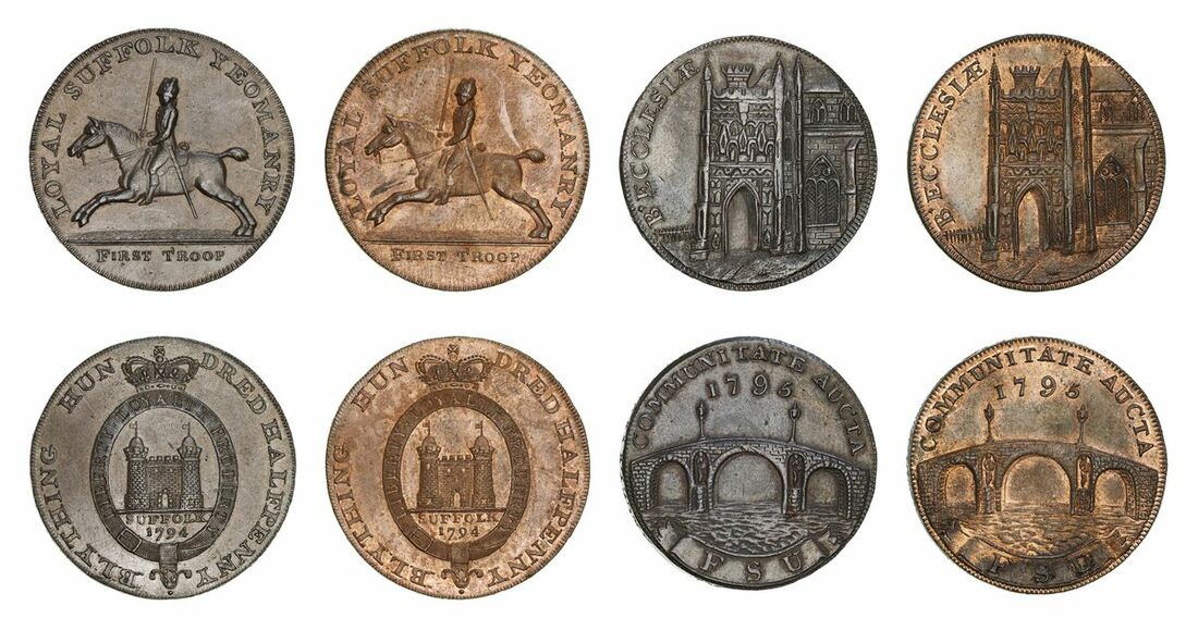 SUFFOLK, Blything, Loyal Suffolk Yeomanry Halfpenny, 1794, mounted yeoman, sword to L, rev. castle within crowned Garter, GOD SAVE THE KING AND CONSTITUTION . X X . on edge, 12h, 11.25g (D&H 19), lustrous and with a handsome mint red, much as struck; another, as before, 12h, 11.30g (D&H 19), couple of contact marks, otherwise extremely fine; Beccles, Halfpenny, 1795, PAYABLE AT BECCLES SUFFOLK on edge, 6h, 11.19g (D&H 16), mostly mint red, much as struck; another, as before, 6h, 11.03g (D&H 16), wiped and lightly marked, very fine (4)
