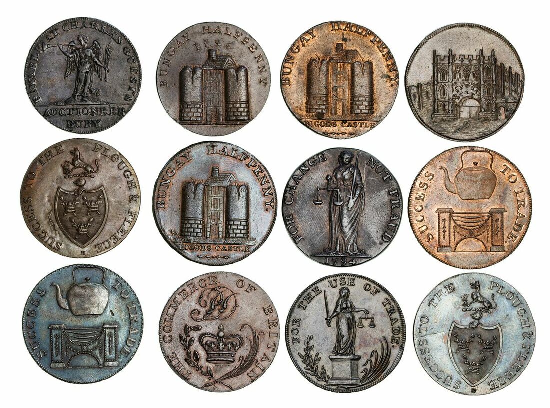 SUFFOLK, Bungay, 'Bigods Castle' Halfpenny, 1794, plain edge, 6h, 10.09g (D&H 22), very fine; another, 1794, PAYABLE IN LANCASTER LONDON OR BRISTOL, on edge, 6h, 11.82g (D&H 22d), wiped, yet hints of red, very fine; another, undated, obliquely milled edge, 6h, 10.29g (D&H 23b), scratch to obverse, yet pleasing mint red, extremely fine; another, 1796, PAYABLE BY N TODD DENTON NORFOLK X, on edge, 6h, 10.75g (D&H 24a), hints of red, extremely fine; Halfpenny, S. PRENTICE S. DELL M. ABEL, on edge, 6h, 8.77g (D&H 21a), extremely fine; Bury, Halfpenny, undated, wolf's head equidistant, PAYABLE AT P. DECKS POST OFFICE BURY . X X ., on edge, 11h, 10.40g (D&H 26), hints of red, extremely fine; another as before, undated, wolf's head closer to THE, PAYABLE AT P. DECKS POST OFFICE BURY . X X ., on edge, 12h, 10.18g (D&H 25), extremely fine; James Goers, Halfpenny, undated, plain edge, 6h, 10.11g (D&H 27), die flaw to the reverse, yet lustrous, toned, hints of red, good extremely fine; Michael Apseys, Halfpenny, undated, obliquely milled edge, 6h, 10.67g (D&H 28), blue tone and lustre, extremely fine; another, as before, milled edge, 6h, 10.45g (D&H 28), mint red, as struck; Packhams, Halfpenny, undated, OR AT LEATHERDALES . X . HARLESTON NORFOLK ., on edge, 6h, 10.06g (D&H 29), brown, extremely fine; Charles Guests, Halfpenny, 1795, obliquely milled edge, 6h, 8.40g (D&H 30), touch of rub to higher points, good very fine (12)