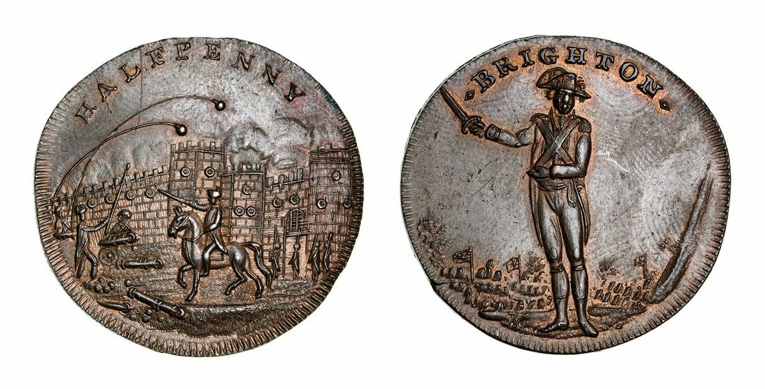 SUSSEX, Brighton, Halfpenny, undated, standing soldier, directing with sword, rev. view of Bastille, plain edge, 12h, 10.42g (D&H 6), hairline scratch to the reverse, otherwise with a pleasing red around the devices, a most intricate and pleasing design, good extremely fine