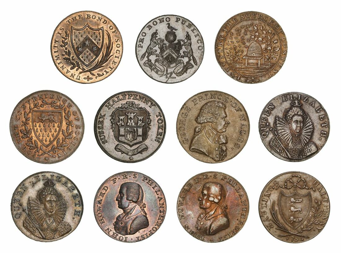 SUSSEX, Brighton, Camp Halfpenny, 1794, BRIGHTON CAMP HALFPENNY on edge, 6h, 9.60g (D&H 2), lustrous, near extremely fine; Chichester, James Dally, Halfpenny, 1794, PAYABLE AT DALLYS CHICHESTER on edge, 6h, 11.07g (D&H 15), about very fine; another, as before, 6h, 10.20g (D&H 15), pleasing lustre to brown surfaces, good extremely fine; Thomas Sharp and Thomas Chaldecott, Halfpenny, 1794, PAYABLE AT SHARPS PORTSMOUTH AND CHALDECOTTS CHICHESTER on edge, 12h, 10.62g (D&H 19), cleaned, very fine; another, as before, obv. differing frill, 12h, 10.49g (D&H 20), about extremely fine; East Grinstead, Boorman's Halfpenny, 1795, PAYABLE AT I + H BOORMAN on edge, 6h, 8.51g (D&H 22), scratch to the obverse, with a dark glossy lustre, extremely fine; Frant, George Ring, Halfpenny, 1794, PAYABLE BY G. RING FRANT on edge, 6h, 9.79g (D&H 23), residual lustre, extremely fine; Hastings, Halfpenny, 1794, plain edge, 6h, 8.70g (D&H 26), some rub, about extremely fie; Northiam, John Foller, Halfpenny, 1794, PAYABLE AT IOHN FOLLER'S NORTHIAM on edge, 5h, 9.46g (D&H 34), handsome red and lustrous, about as struck; G. Gilbert, Halfpenny, 1794, PAYABLE AT G. GILBERTS NORTHIAM on edge, 6h, 9.78g (D&H 35), some residue to the higher points, otherwise with near full mint red surfaces, about as struck; Winchelsea, Richard Maplesdens, Halfpenny, 1794, PAYABLE AT RICHARD MAPLESDENS WINCHELSEA on edge, 6h, 9.62g (D&H 40), near extremely fine (11)